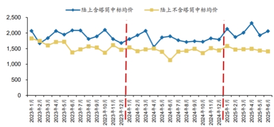 2.项目进度加速,十四五收官之年装机放量 进入2025年,海上风电项目进度明显提速,此前迟滞的重点项目开始进入集中建设期。广东地区的青洲五、七和帆石一、二项目已在2025年上半年进入全面施工阶段,并有望在2025年底前实现全容量并网。 这些项目的加速推进,直接带动了风电设备企业的订单交付节奏。从全国范围来看,2025年海上风电新增并网容量有望达到10-15GW,其中广东省将成为最主要的海风新增并网省份,预计有接近7-8GW海风项目将在2025年陆续进入投产周期。 项目进度加速的背后是2024年的巨量招标在2025年陆续释放,根据国家能源局数据,2025年上半年全国新增风电装机5139万千瓦,相比去年同期的2584万千瓦,增幅接近100%。机构预测全年装机量将达110-120GW,连续第三年刷新纪录。 3.十五五政策护航产业发展 在2025年北京国际风能大会上发布的《风能北京宣言2.0》提出了远超预期的风电发展目标。宣言称,“十五五”是中国风电步入全面市场化发展阶段的第一个五年,期待国家主管部门应加紧完善体制机制,深化电力体制改革,形成真正适应高比例风电的市场机制,借助市场化手段促进风电发展。 除了装机目标,政策层面也为海上风电发展提供了持续支持。2025年10月,财政部、海关总署和税务总局联合发布公告,明确自2025年11月1日起至2027年12月31日,对纳税人销售自产的利用海上风力生产的电力产品,实行增值税即征即退50%的政策。继续给予海上风电税收优惠,是国家对这块“难啃的骨头”的明确支持,意在鼓励企业向更深、更远的海域发展,提升我国海上风电的技术和装备水平。 从政策落实与传导来看,随着近海海风的开发逐渐成熟,沿海省份陆续开始规划深远海风的开发。部分省份早在“十四五”规划中就明确了稳妥推进国管海域的深远海风项目;2023年,广西和江苏陆续启动了深远海风项目的前期工程咨询招标,上海市对深远海风通航安全的影响分析进行了供应商的征集,充分说明沿海各省(区)已经为深远海风的规模化发展做好了前期准备。 4.行业自律成效显著,风电反内卷重塑竞争格局 风电行业曾经深受低价恶性竞争的困扰,但这一状况在今年得到了极大的扭转。2024年10月,12家风电整机企业在北京国际风能大会上共同签署了《中国风电行业维护市场公平竞争环境自律公约》,这成为风电行业价格反转的关键节点。自律公约发布后,国内风机招投标价格明显回升。 数据显示,中国陆上风电机组(折减塔筒)的加权平均中标价由2024年9月的1286.2元/kW稳步回升至2025年4月的1613.5元/kW,并且连续三个月稳定在1600元/kW以上。2025年1-5月,国内风机招标价格水平相比2024年全年的平均价格水平有明显上升,增幅达5个百分点以上。